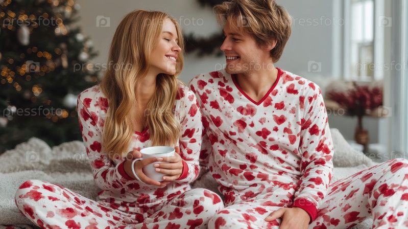 Теплая семейная пара, Пара наслаждается праздничным утром, Расслабленный дуэт с какао рядом с рождественской елкой, Интимная пара делится праздничным настроением с теплыми напитками и улыбками