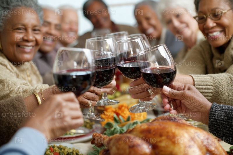 Кавказские семейные тосты за праздничным обеденным столом, ношение трикотажных свитеров, поднятие бокалов для вина, обжаренная центральная часть индейки, теплые струнные огни, сосновая гирлянда,