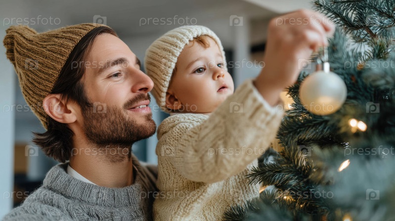 Ребенок украшает праздник Рождественская елка, уютная семья, украшающая вместе в праздничный сезон, теплый семейный момент, когда маленький ребенок тянется к блестящему праздничному орнаменту