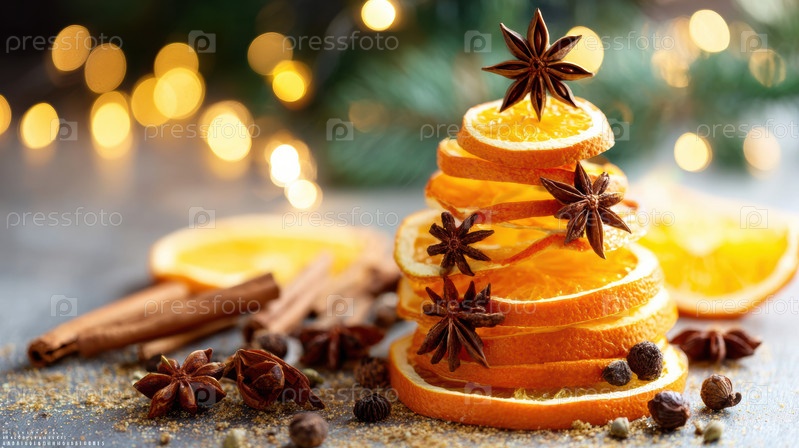 Праздничный цитрусовый гарнир, декоративные сушеные апельсиновые ломтики, рустический праздничный центр с специями, элегантное расположение сушеных апельсинов и специй, установленных на деревенской деревянной поверхности