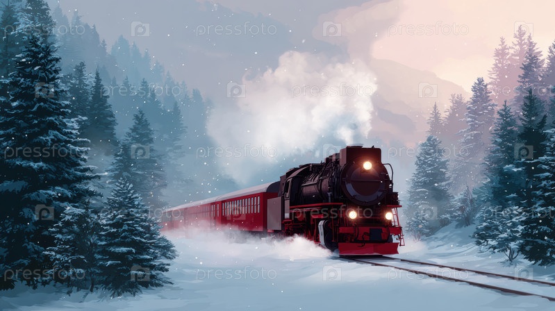Приключение паровоза, классический красный паровой двигатель, движущийся в зимнем ландшафте, старомодный поезд, дрожащий в снежном лесу под синей зимой
