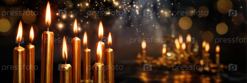 Безмятежная зимняя сцена со свечами, Яркая праздничная обстановка с мерцающими огнями, Поднятие праздничного дисплея с спокойной атмосферой, усиленной мерцающими огнями свечей