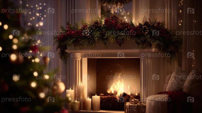 Праздничная уютная сцена в помещении, приглашение зимней вечерней атмосферы с сезонными украшениями, очаровательное праздничное жилое пространство с утешительными элементами и нежным освещением