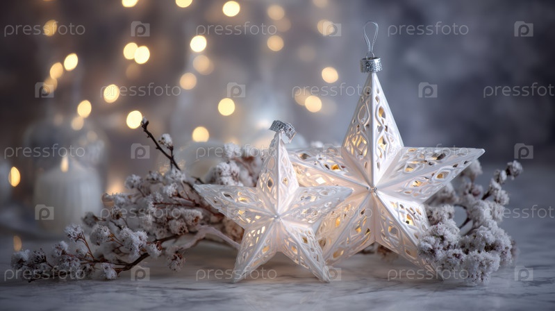 Серебряные белые звездные украшения с освещенным фоном Боке для праздничного декора. Зимний рождественский декор