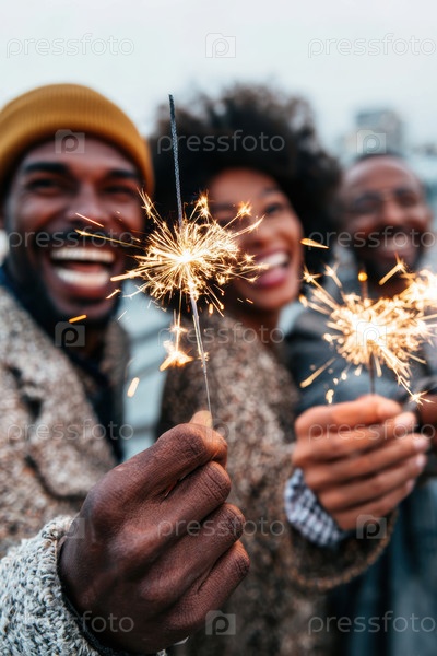 Радостное празднование свечей, Друзья веселые со светящимися искрами во время вечерних праздников, искренний момент улыбки друзей и веселья с искрами на открытом воздухе
