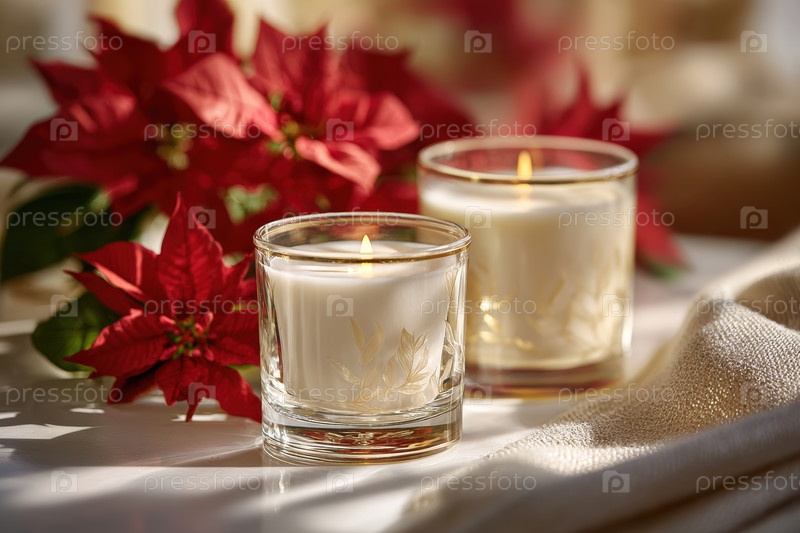 Уютная праздничная сцена с яркими свечами и декоративными цветочными элементами, элегантное расположение свечей с акцентами пуансеттии, создающими теплую праздничную атмосферу и мягкое освещение