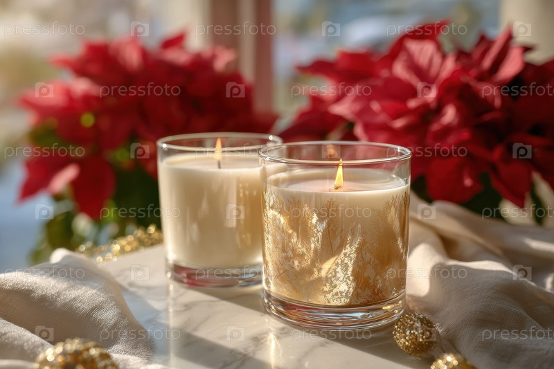 Уютная праздничная сцена с яркими свечами и декоративными цветочными элементами, элегантное расположение свечей с акцентами пуансеттии, создающими теплую праздничную атмосферу и мягкое освещение