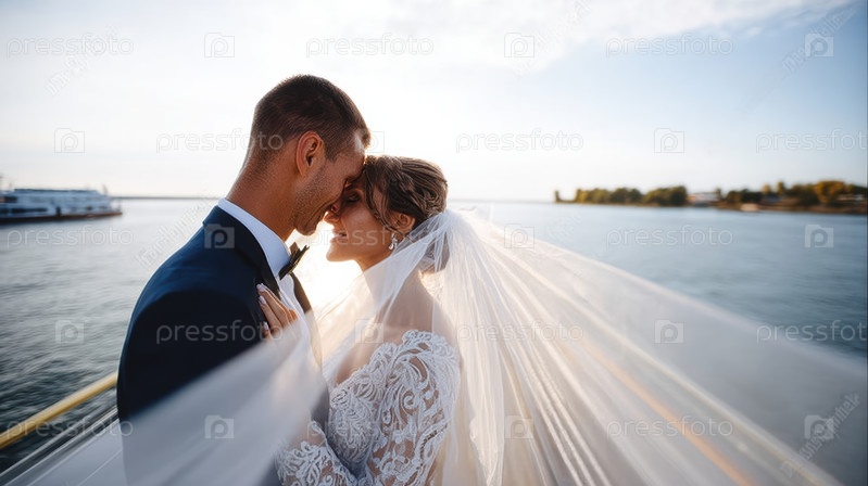 Романтический момент между невестой и женихом с потрясающим видом на набережную на закате, создавая прочные воспоминания