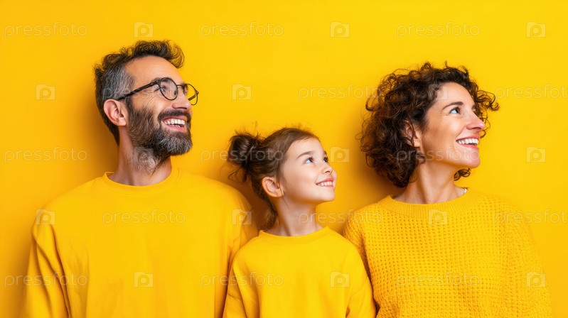 Радостный и счастливый семейный портрет в ярких желтых свитерах на фоне красочного и яркого фона