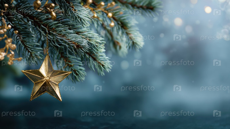 Рождественские ветви елки обрамляют золотой звездой на размытом синем фоне. Рождество и зимнее время