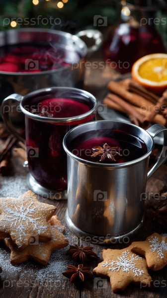 Уютные сезонные напитки и украшения, Теплые напитки и праздничные украшения создают праздничную атмосферу, особенности сцены - парящее глинтвейн и праздничные украшения, создающие тепло