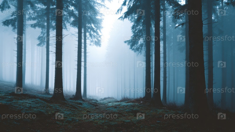 Туманный сосновый лес на рассвете, туман, дрейфующий между высокими стволами, синий свет, фильтрующий через иглы, мховая земля и редкий подлесок, создающий эфирное спокойствие