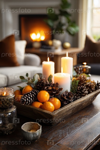 Праздничная уютная атмосфера, Веселый домашний стиль, освещенный свечами и украшениями, Приглашение праздничной среды со свечами и сезонными украшениями, создающими тепло