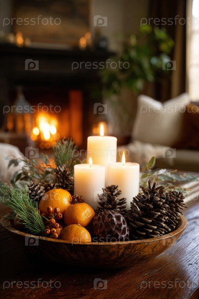 Праздничная уютная атмосфера, Веселый домашний стиль, освещенный свечами и украшениями, Приглашение праздничной среды со свечами и сезонными украшениями, создающими тепло