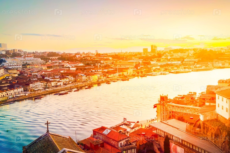 Живописный, красочный вид на старый город Порту и виллу Нова ди Гая ночью, Португалия с мостом Понте Дом Луис над рекой Дору. Опорто, туристический средиземноморский город