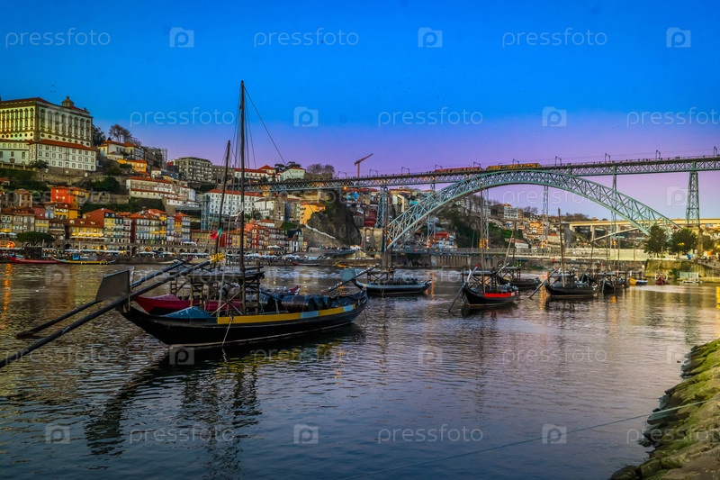 Живописный, красочный вид на старый город Порту на закате над рекой Дору. Опорто, туристический средиземноморский город