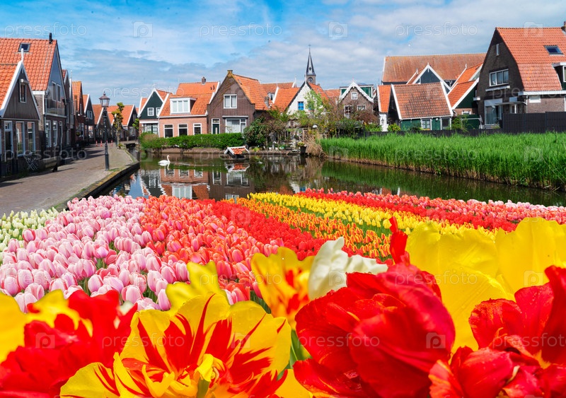 Сельская загородная улица Нидерландов, маленький старый город Волендам,