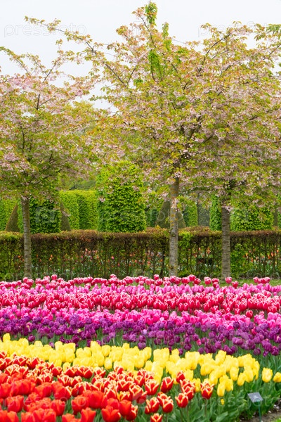 Красочные тюльпановые кровати в саду, ряды красных розово-желтых тюльпанов под цветущими деревьями и подстриженными изгородями, мягкий утренний солнечный свет, спокойное весеннее настроение,