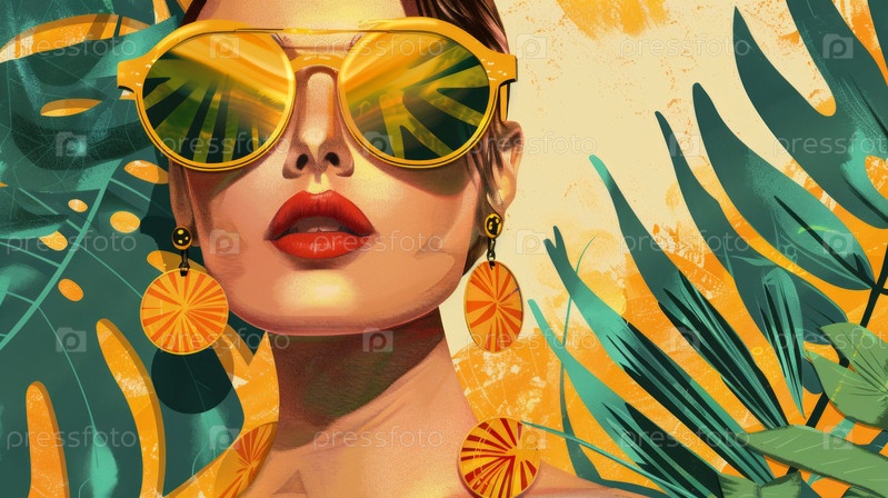 Женщина модно одета, летний яркий фон, винтажный плакат