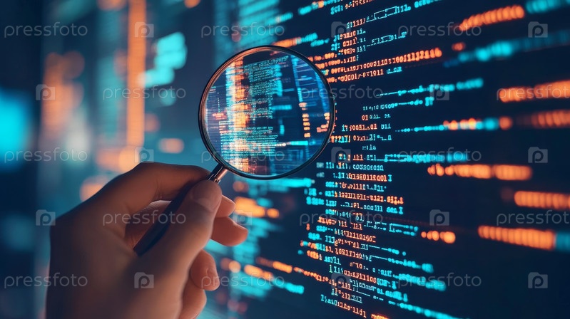 Кто-то держит увеличительное стекло близко к экрану с цифровым кодом на нем