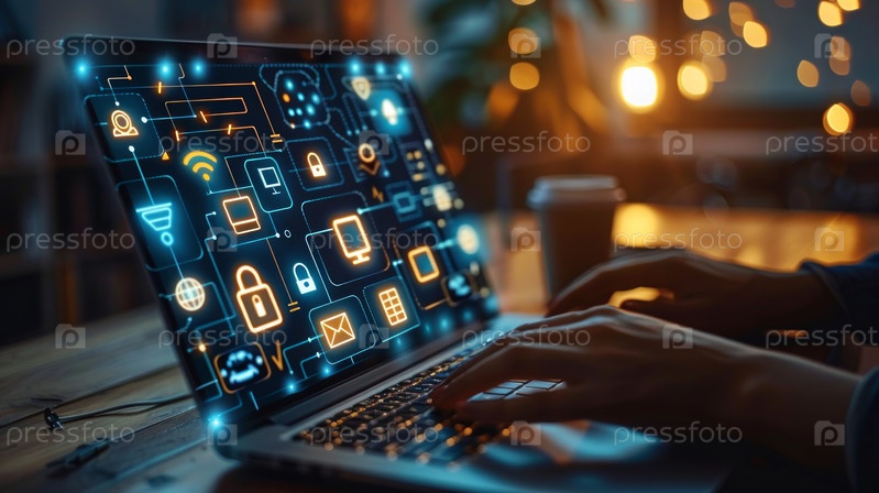 Кибербезопасность в Интернете с человеком, касающимся интерфейса с иконками доступа к беспроводной сети на ноутбуке,