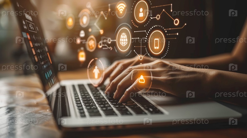 Кибербезопасность в Интернете с человеком, касающимся интерфейса с иконками доступа к беспроводной сети на ноутбуке,