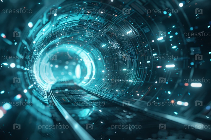 Цифровой поток данных цифр и букв в темном туннеле со светом, футуристический фон для технологической концепции