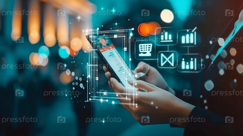 Бизнесмен, использующий мобильный интернет-банкинг и платежи, цифровой маркетинг. Финансовые и банковские сети. Сетевое подключение клиентов и иконки интернет-магазинов кибербезопасность, бизнес-технологии