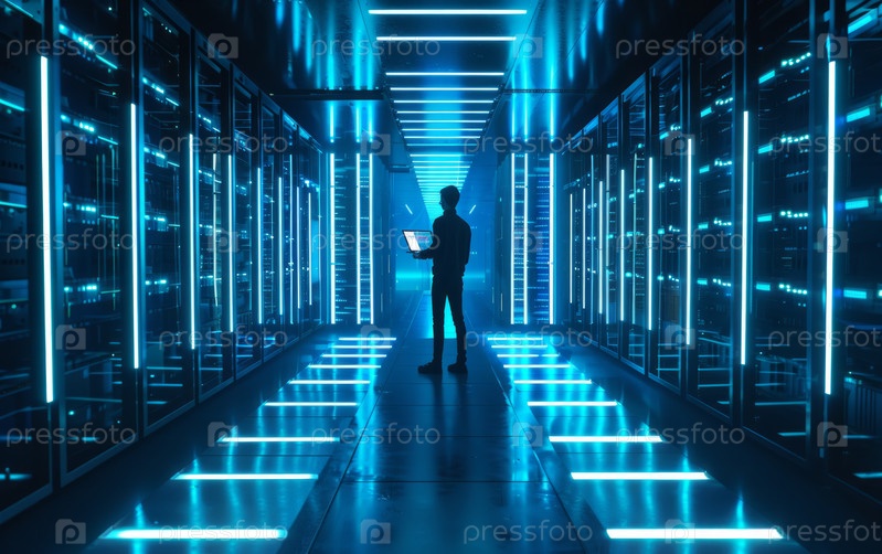 В большом дата-центре инженер держит ноутбук, стоящий перед супербольшим сервером