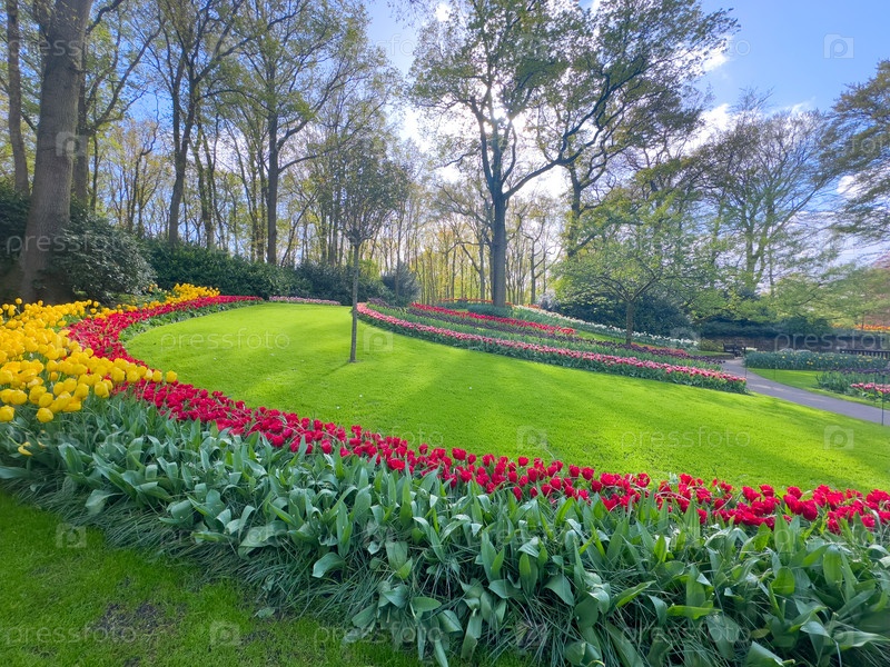Солнечные цветочные часы с красными тюльпанами, ухоженный зеленый газон и желтые кровати, высокие лиственные деревья и извилистые дорожки, сезонный пейзаж парка