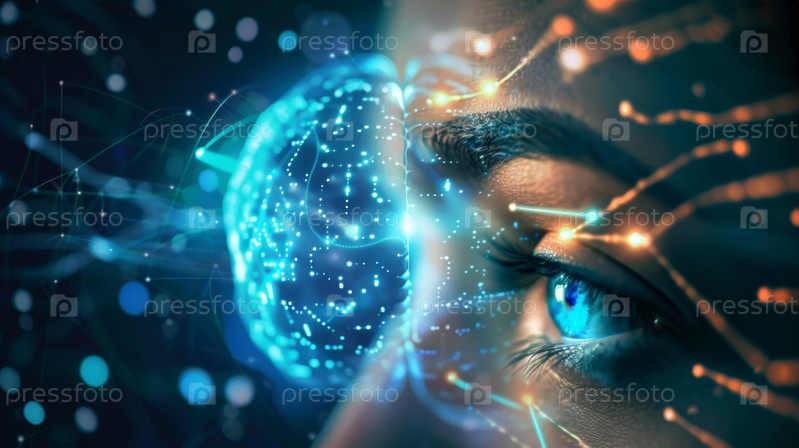 Визуализация нейронной сети с цифровым мозгом. Концепция технологии ИИ с динамическими данными и яркими цветами