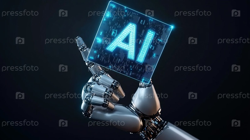 Металлическая рука робота-гуманоида держит знак «AI», инновационный и продвинутый чип AI Accelerated. Гуманоидный робот с блестящим футуристическим процессором Искусственный интеллект микрочип