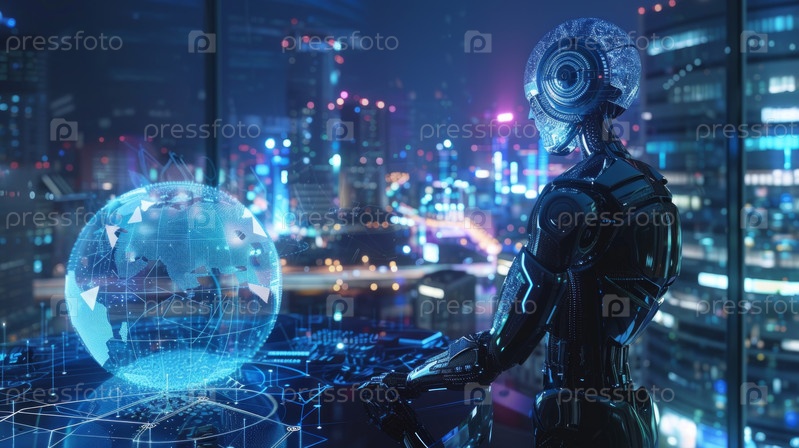 Робот стоит за интерактивным столом с голограммой умного города. Киборг работает с виртуальным абстрактным сферическим интерфейсом