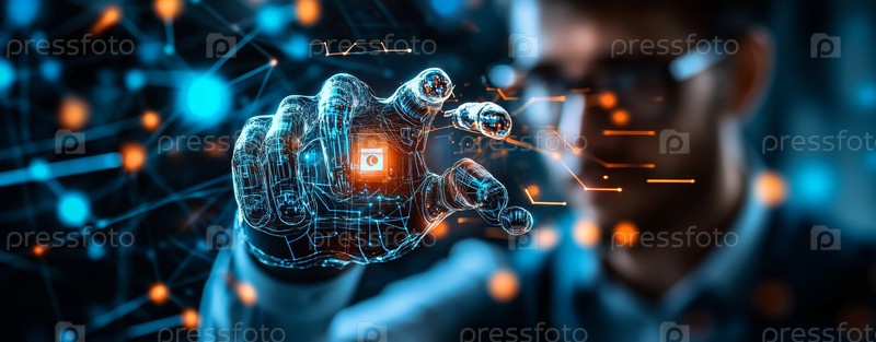 Вдумчивый молодой человек окружен яркими цифровыми визуализациями данных, символизирующими инновации и творчество