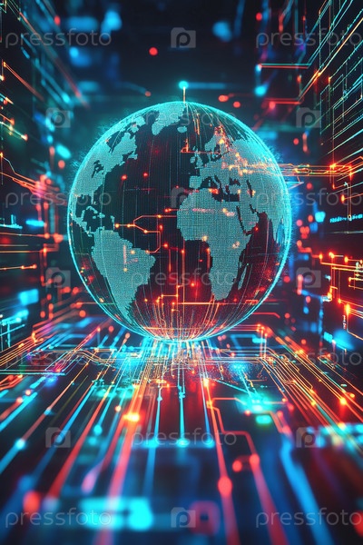 Ночной вид на Землю со светящейся сетью, охватывающей континенты, освещенные городские кластеры, связанные золотыми следами данных, спутниковая перспектива подчеркивает цифровую реальность