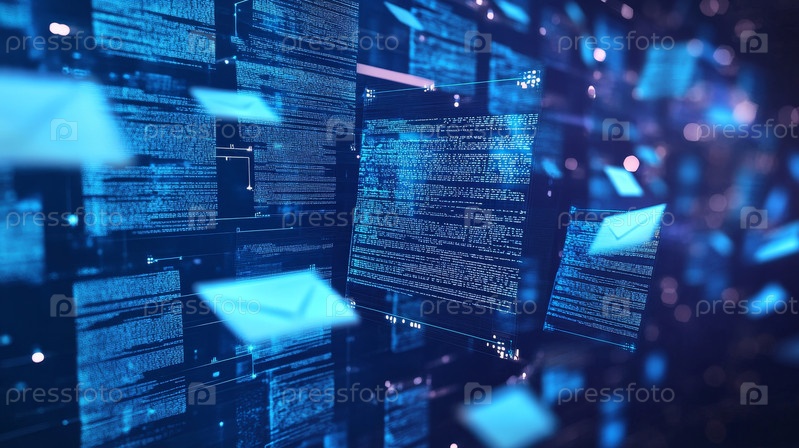 Футуристический робот печатает подробные данные в высокоразвитой цифровой среде, демонстрируя бесшовную техническую интеграцию
