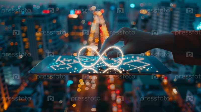Концепция неограниченного интернета. Ручное касание белого планшета с цифровой голограммой знака бесконечности на темном размытом фоне города. Идея концепции, жизнь, успех, бизнес, выстрел на dslr,iot Powered Finance