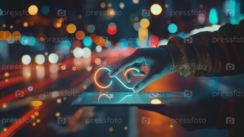 Концепция неограниченного интернета. Ручное касание белого планшета с цифровой голограммой знака бесконечности на темном размытом фоне города. Идея концепции, жизнь, успех, бизнес, выстрел на dslr,iot Powered Finance