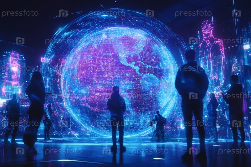 Исследуйте яркий цифровой мир с потрясающими голографическими фигурами в прекрасно освещенной глобальной сфере