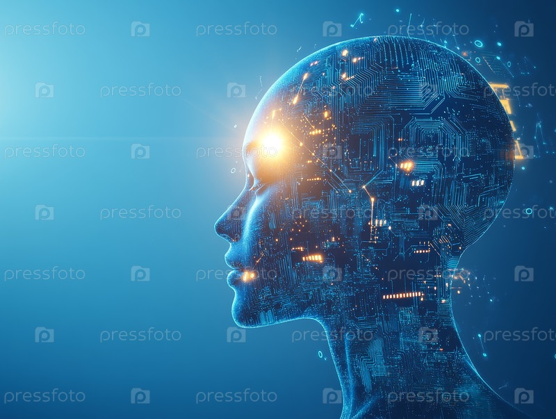 Вид профиля синей цифровой головы человека со светящейся схемой, установленной на синем фоне