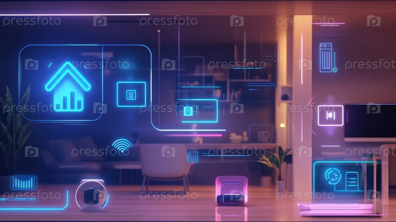 Голографический неоновый интерфейс умного дома, отображающий плавающие значки данных, роботизированный вакуум, перемещающийся по полу из лиственных пород дерева, гладкий диван, стеклянная стена, окружающий фиолетовый