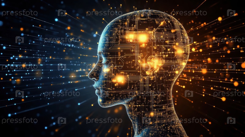 Светящаяся цифровая головка, построенная из узлов и светящегося силуэта данных, состоящего из частиц и цепей, динамических световых следов и излучающих лучей сети