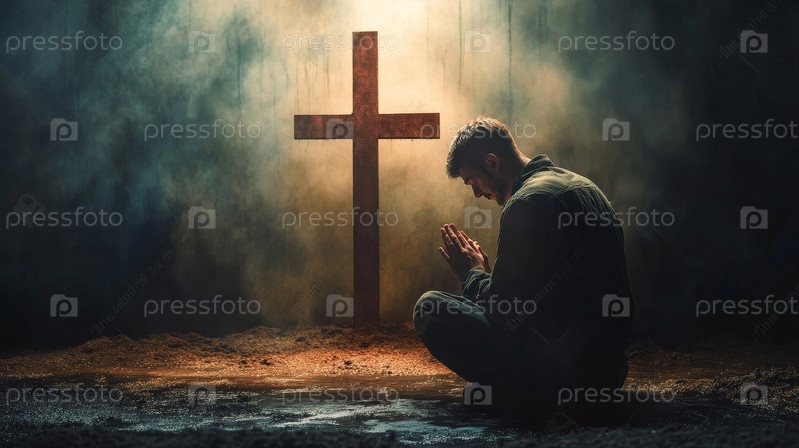 Мрачная фигура преклоняет колени в сердечной молитве, мягко освещенной светящимся крестом в красивой мистической обстановке