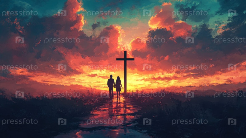 Пара, держащаяся за руки, изображена на фоне заката и креста, символизирующего любовь и глубокую веру