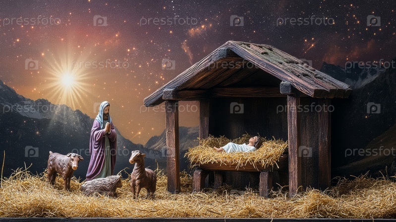 Рождественская сцена, христианская рождественская концепция, Рождение Иисуса Христа. Деревянные ясли со святым ребенком в сарае в темно-синюю ночь