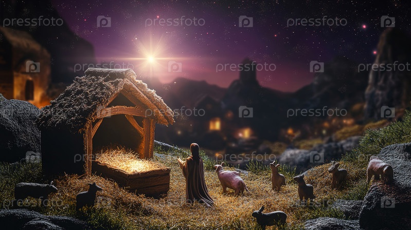 Рождественская сцена, христианская рождественская концепция, Рождение Иисуса Христа. Деревянные ясли со святым ребенком в сарае в темно-синюю ночь