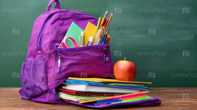 Фиолетовый рюкзак, наполненный красочными принадлежностями на деревянном столе на фоне меловой доски. Сложенные блокноты и папки, карандаши и линейка, выступающие из открытого кармана,