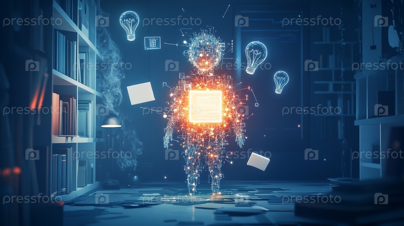 Светящийся золотой цифровой бюст, окруженный закрученными данными, плавающими глифами, уложенными книгами, винтажным светильником тепла, кинематографическим боке, эфирным ореолом чисел,