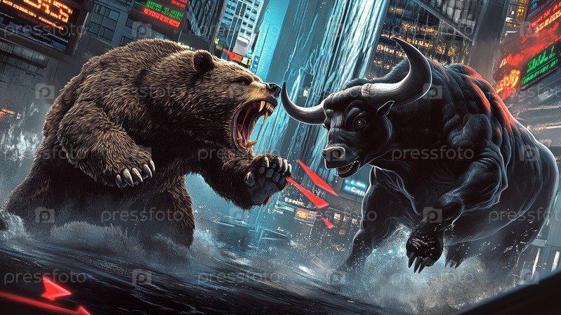 Это поразительное цифровое представление с мощным быком и медведем на фоне вдохновленного технологиями мира