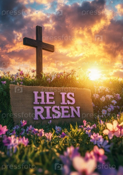 Пасхальный плакат со словами HE IS RISEN большими буквами на фоне, идеально подходящем для бурлапного садового флага, красочного восхода солнца над зеленым лугом с цветущими цветами,